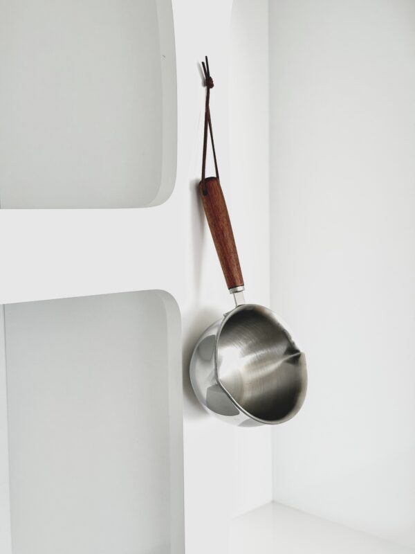 Minimalist tasarımıyla göz alıcı bir sadelik sunan bu 200 ml hacmindeki çelik ölçü kabı, mutfakta zarafet arayanların vazgeçilmez yardımcısı olmaya aday. Parlak paslanmaz çelik gövdesi, sağlamlığı ve hijyenik yapısıyla uzun ömürlü kullanım vaat ederken; doğal ahşaptan üretilmiş ergonomik sapı, hem estetik bir dokunuş hem de güvenli tutuş sağlar. Sap kısmındaki deri askı detayı ise kullanım sonrası kolayca asılarak saklanmasını mümkün kılar.
