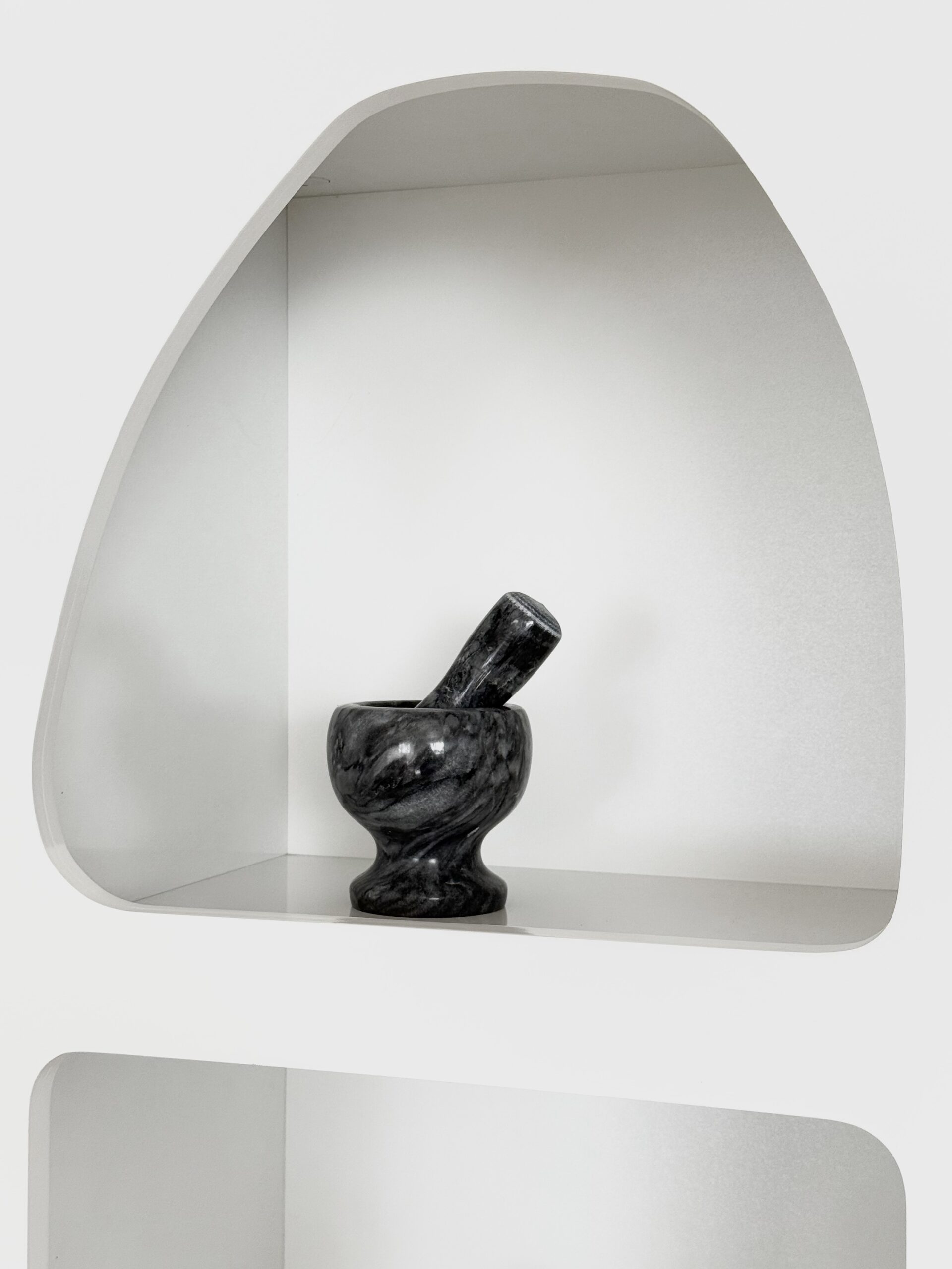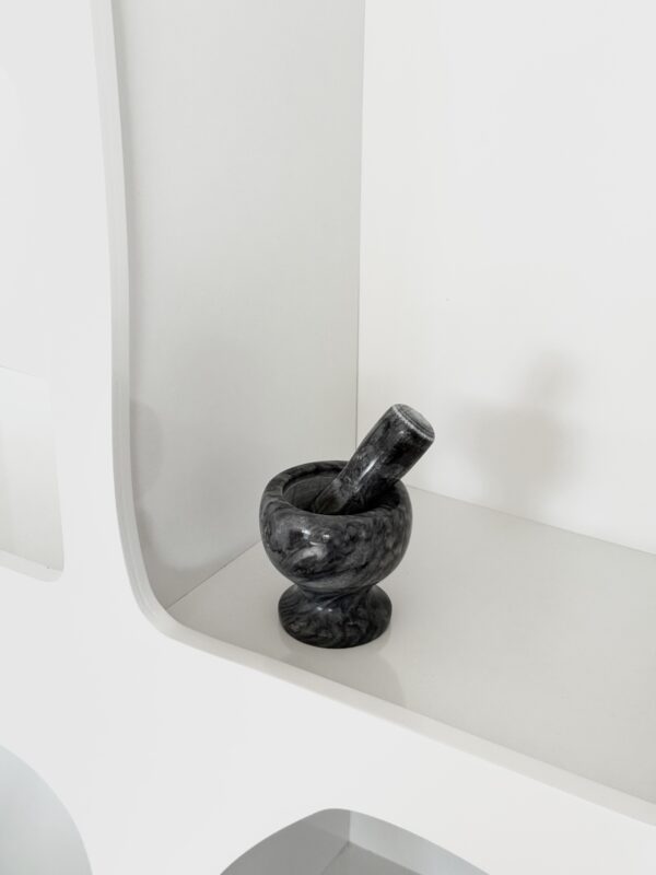 Zarif mermer dokusunun göz alıcı şıklığıyla bezenmiş bu havan, mutfakta geçmişten günümüze uzanan bir ritüelin simgesi gibi duruyor. Parlak yüzeyi, doğal mermerin eşsiz damarlarıyla süslenmiş, zamanın ötesinden gelen bir ihtişamı yansıtıyor. Sağlam ve ağır yapısıyla, en sert baharatları bile kolayca öğüterek aromasını ortaya çıkarırken, her kullanışta bir zanaatkârın elinden çıkmış gibi hissettiriyor. Bulunduğu rafı adeta sanatsal bir esere dönüştüren bu taş havan, işlevselliği ve estetiği aynı potada eriten nadide bir mutfak objesi…